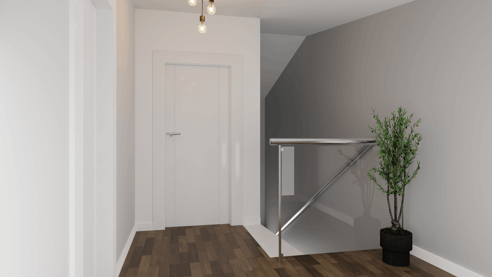 Zum Flurbereich des oberen Stockwerks führt eine passende Innentreppe.