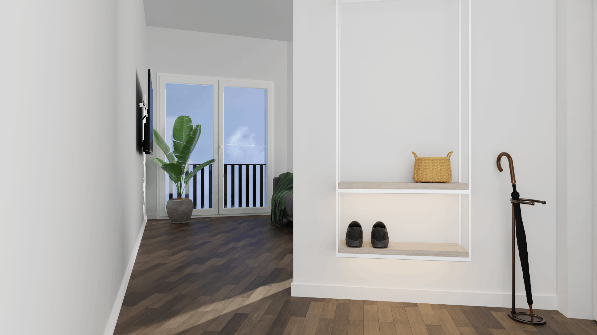 Die untere Etage: Wir beginnen mit dem wunderschönen Eingangsbereich. Bad, Abstellzimmer und Wohn-Esszimmer und Küche sowie ein Balkon findet man auf der unteren Etage. Zusätzlich im gleichen Stockwerk, jedoch nicht innerhalb der Wohnung - ist noch ein weiterer externer Abstellraum enthalten.