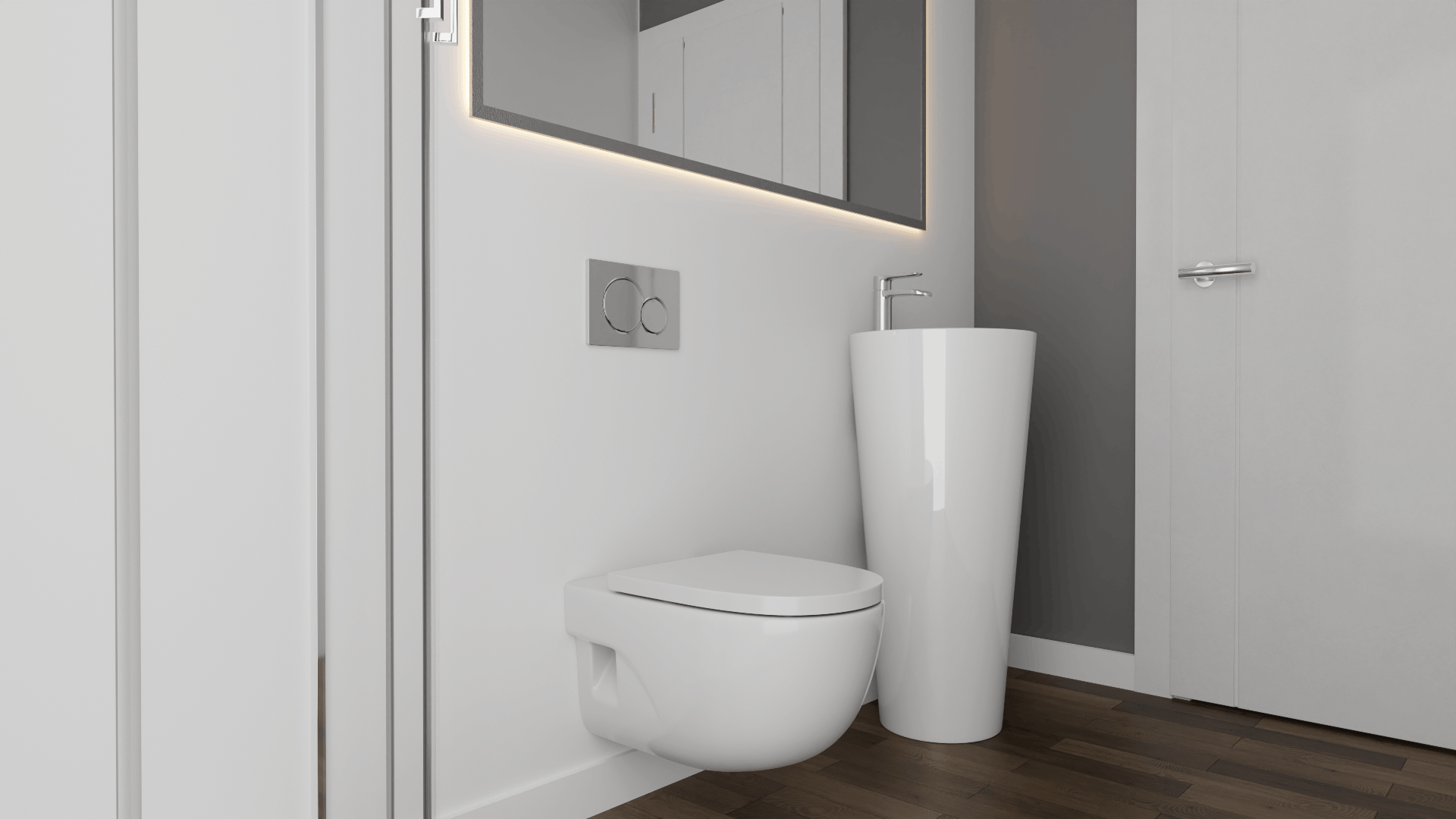Exklusive Keramikausstattung von Villeroy & Boch Serie Subway 2.0, weiß und Vigour • Armaturen von Hansgrohe Serie Metris, Chrom • Schalgedämmte Abwasserrohre