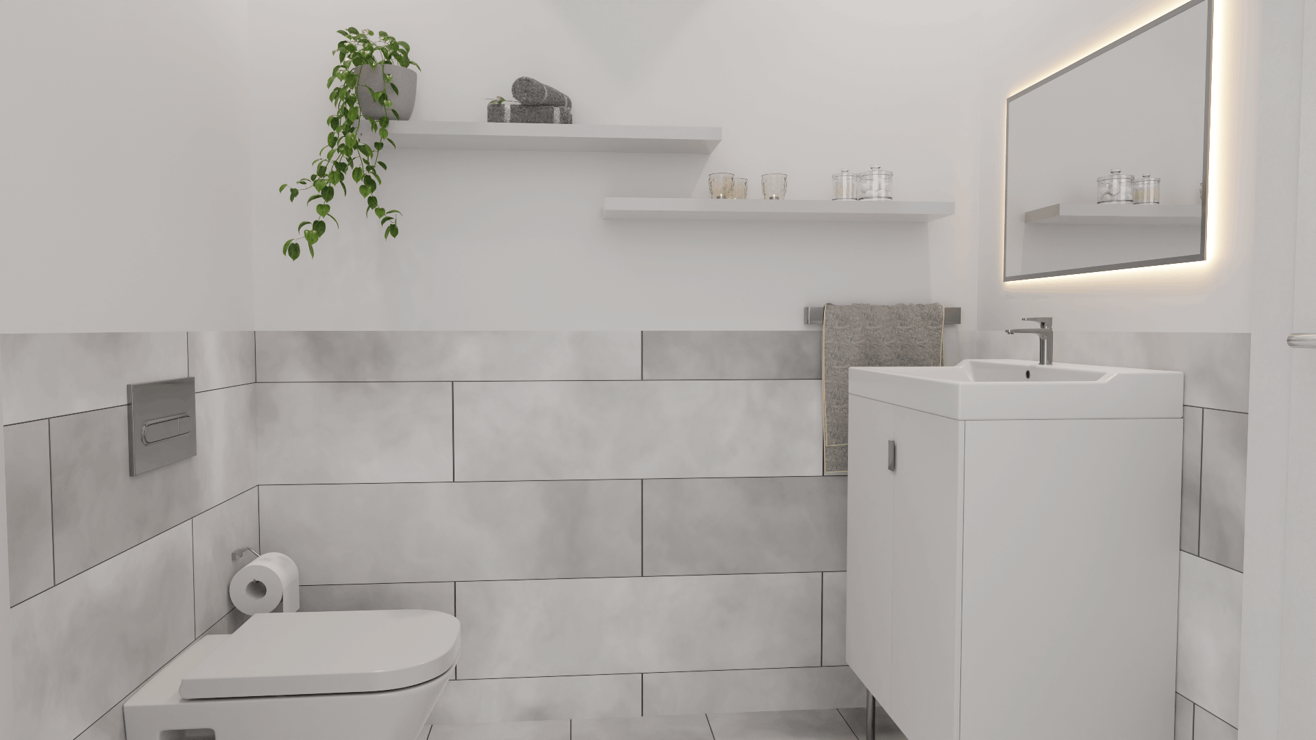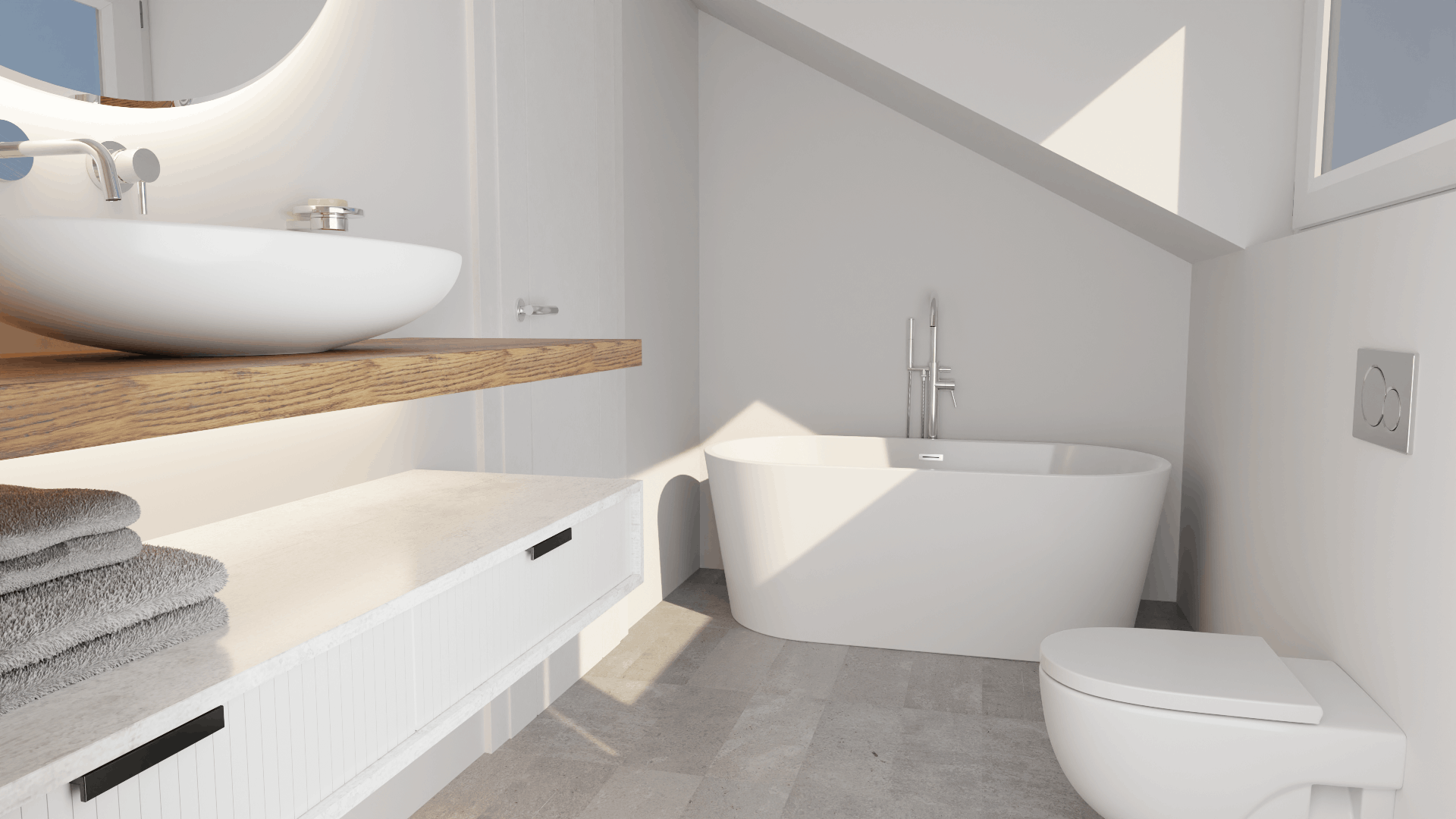 Exklusive Keramikausstattung von Villeroy & Boch Serie Subway 2.0, weiß und Vigour • Armaturen von Hansgrohe Serie Metris, Chrom • Schalgedämmte Abwasserrohre