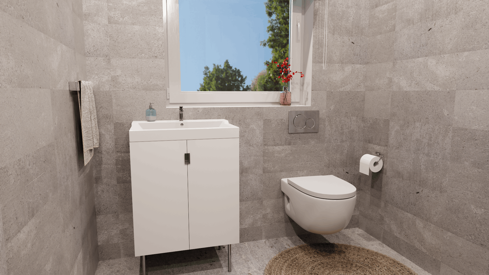 Exklusive Keramikausstattung von Villeroy & Boch Serie Subway 2.0, weiß und Vigour • Armaturen von Hansgrohe Serie Metris, Chrom • Schalgedämmte Abwasserrohre