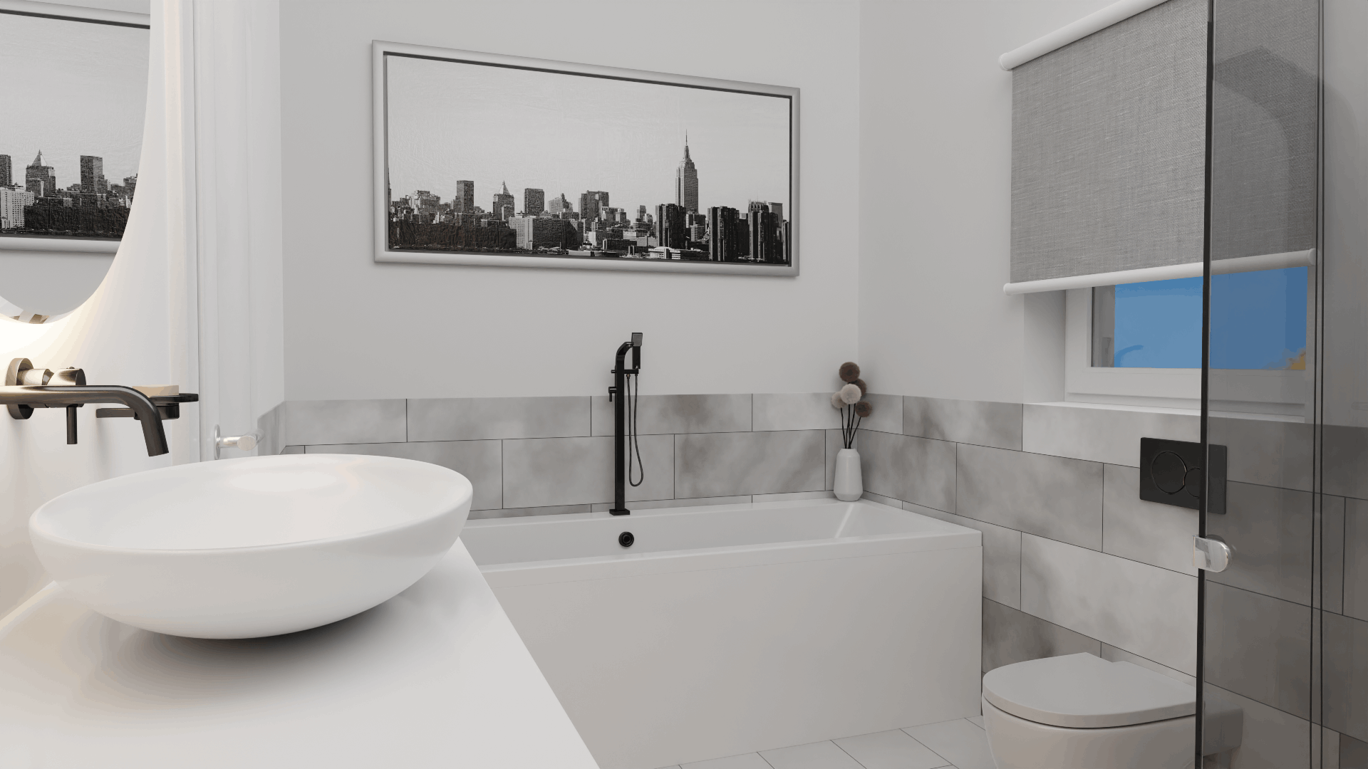 Exklusive Keramikausstattung von Villeroy & Boch Serie Subway 2.0, weiß und Vigour • Armaturen von Hansgrohe Serie Metris, Chrom • Schalgedämmte Abwasserrohre