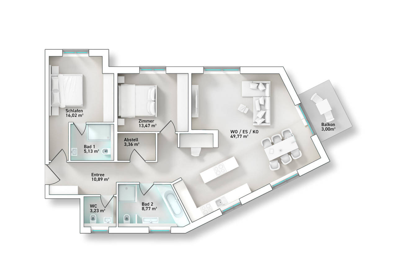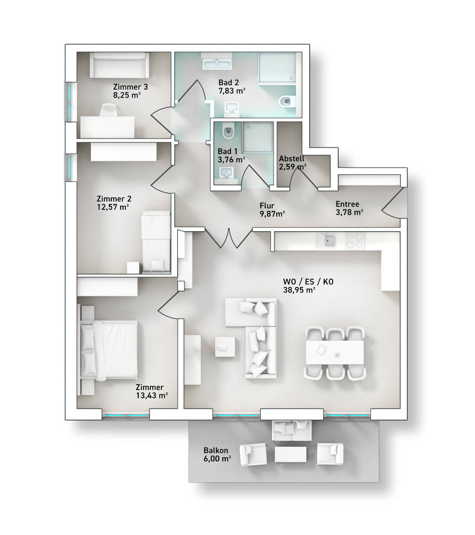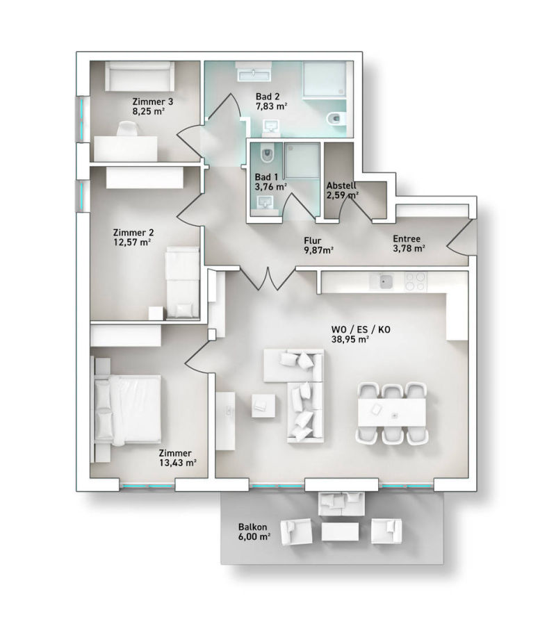 Zur gehobenen Ausstattung dieser modernen Wohnungen gehöhren Bäder mit Wanne und bodengleicher Dusche, offene Küchen, bodentiefe Fenster für helle Räume und eine Fußbodenheizung.